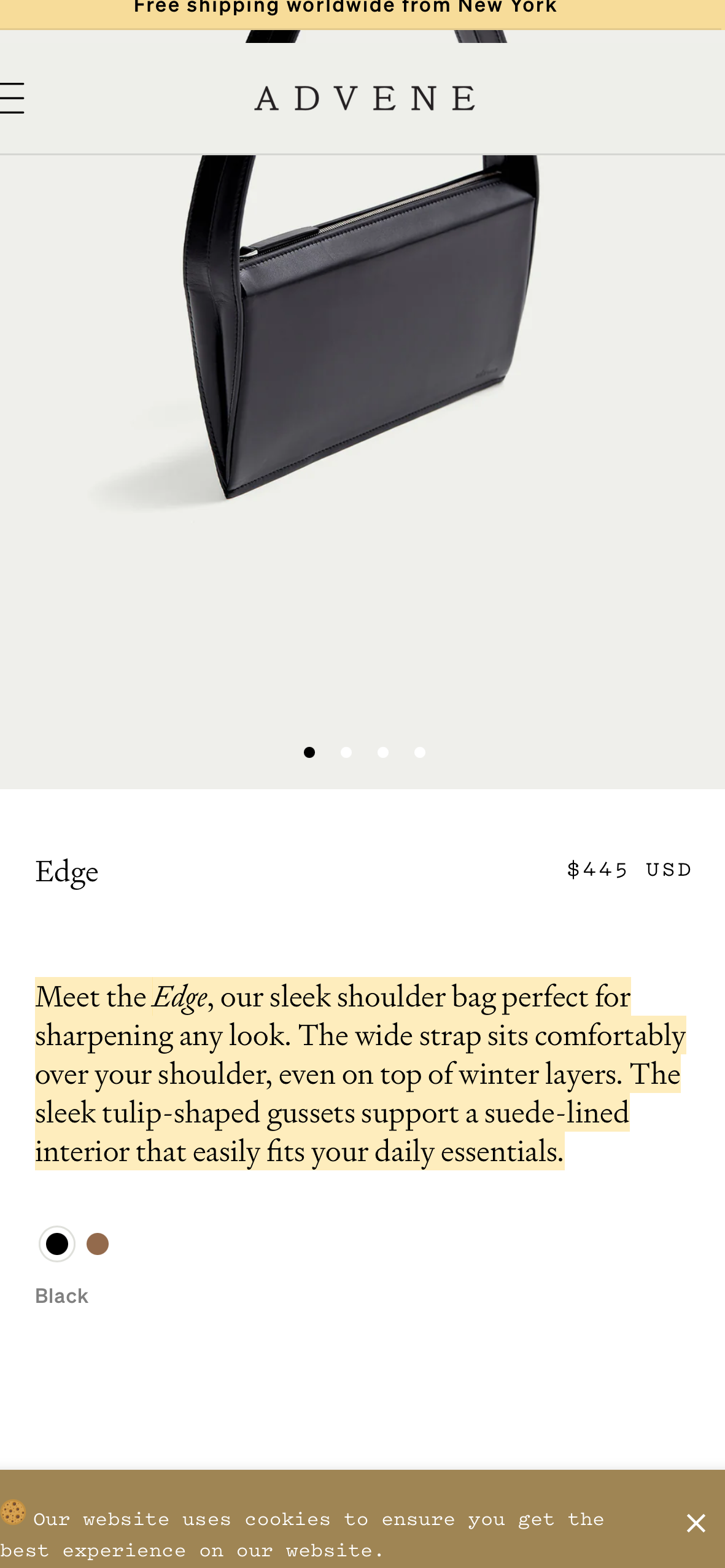 Other Information: ADVENE - The Edge Leather Bag. Small tear on inside lining. With original tags. Otherwise great condition. Original retail $445